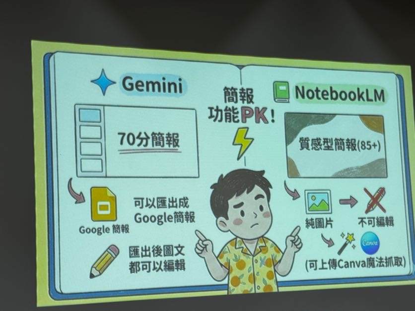 📗 NotebookLM:資料整合到「高質感輸出」的魔術師 NotebookLM 可將大量資料整合後,自動生成: 一頁式知識地圖 影片 圖表 條理分明的質感型簡報 儘管目前僅能輸出為「純圖片」格式(無法編輯),但作品呈現的質感與結構已讓在場師生驚艷。 此外,老師也分享了可精準搜尋學術論文的 AI 工具 https://consensus.app/ ,能提供可驗證的引用資料,大幅提升寫作與投稿的可信度。