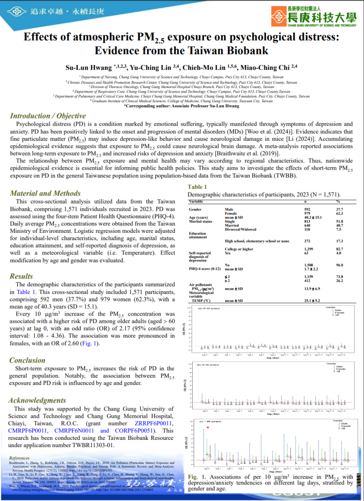 Psychological distress (PD) is a condition marked by emotional suffering, typically manifested through symptoms of depression and anxiety. PD has been positively linked to the onset and progression of mental disorders (MDs) [Woo et al. (2024)]. Evidence indicates that fine particulate matter (PM2.5) may induce depression-like behavior and cause neurological damage in mice [Li (2024)]. Accumulating epidemiological evidence suggests that exposure to PM2.5 could cause neurological brain damage. A meta-analysis reported associations between long-term exposure to PM2.5 and increased risks of depression and anxiety [Braithwaite et al. (2019)]. The relationship between PM2.5 exposure and mental health may vary according to regional characteristics. Thus, nationwide epidemiological evidence is essential for informing public health policies. This study aims to investigate the effects of short-term PM2.5 exposure on PD in the general Taiwanese population using population-based data from the Taiwan Biobank (TWBB).